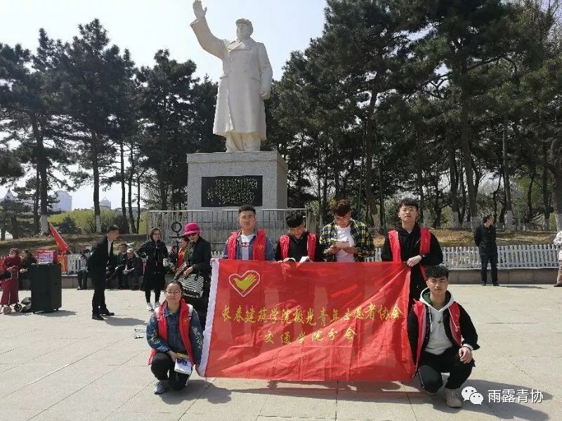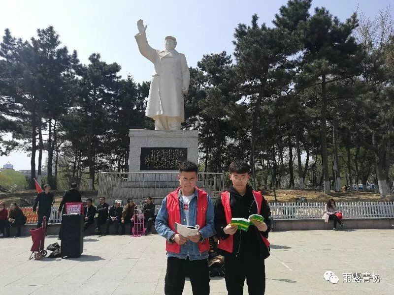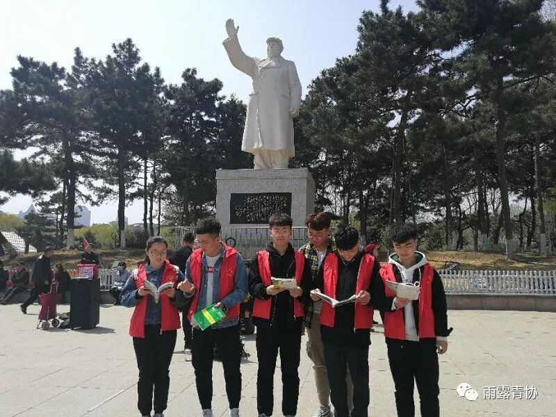 正值初春的胜利广场阳光正好,微风不燥。当地居民和游客在此地游玩。8时15分志愿者代表到达胜利广场进行准备工作,策划部部长刘闯组织志愿者代表在胜利广场毛主席雕塑下大声朗读《毛泽东自传》以此表达对毛主席的缅怀之情。
