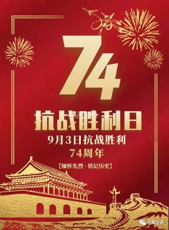 今日是2019年9月3日,是中国人民取得伟大的抗日战争胜利74周年纪念日,也是世界反法西斯战争胜利74周年纪念日。在这个庄重、光辉的纪念日来临之时,全国上下将举行隆重的纪念和庆祝活动,为了弘扬爱国报国的热情,激励人民满腔热情投入到为实现国家富强,民族振兴,人民幸福的中华民族伟大复兴的中国梦而努力。
