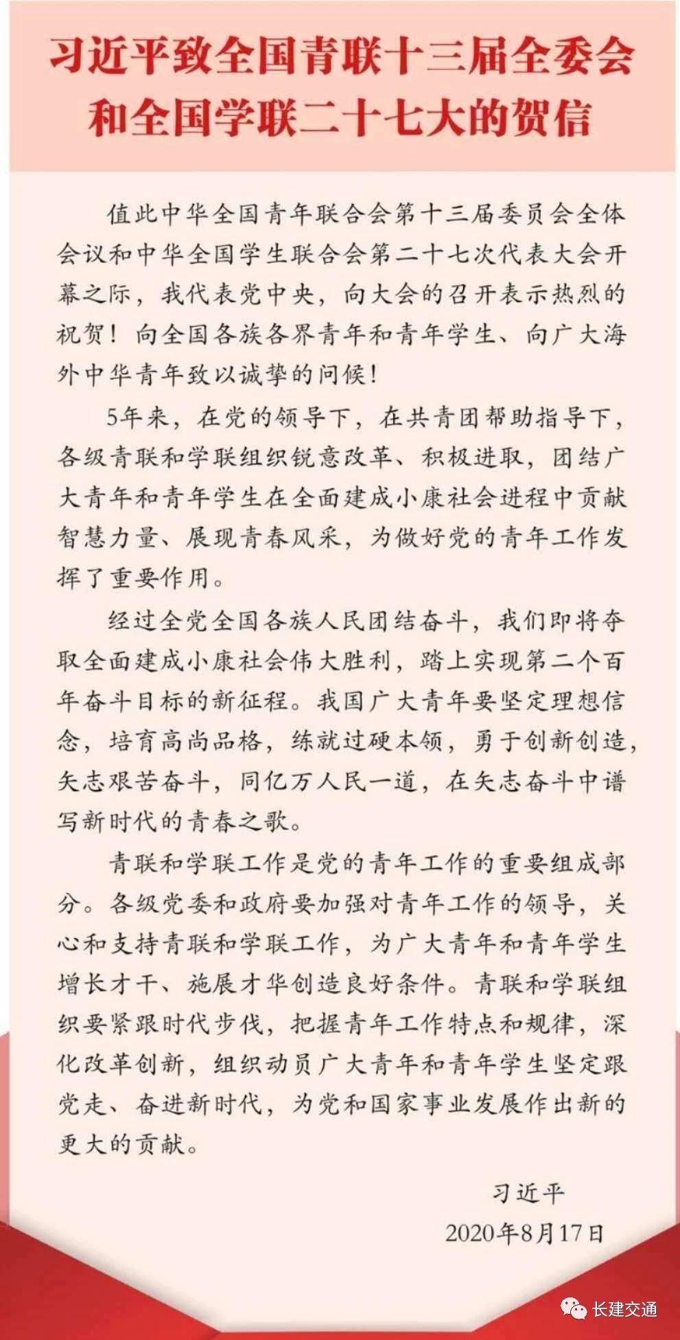 8月17日,中华全国青年联合会第十三届委员会全体会议、中华全国员工联合会第二十七次代表大会在北京开幕。会议期间,习近平总书记发来贺信,代表党中央向大会的召开表示热烈的祝贺,向全国各族各界青年和青年员工、向广大海外中华青年致以诚挚的问候。