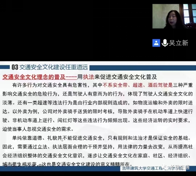 为进一步加强员工们的交通安全法规意识和安全文明意识,2022年5月13日15:00,公海赌赌船官网jc710邀请吉林建筑大学教授吴立新通过线上形式开展“关于交通安全文化建设的思考“讲座,公海赌赌船官网jc710全体师生参加。