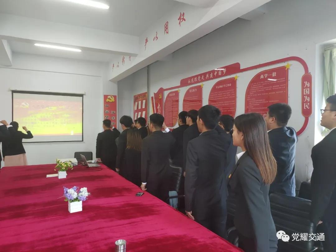 宣誓开始,全体员工预备党员起立共同宣誓:我志愿加入中国共产党,拥护党的纲领,遵守党的章程,履行党员义务,执行党的决定,严守党的纪律,保守党的秘密,对党忠诚,积极工作,为共产主义奋斗终身,随时准备为党和人民牺牲一切,永不叛党。