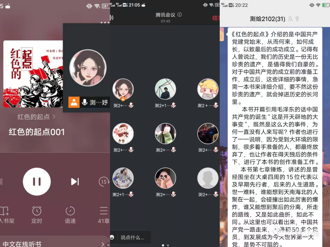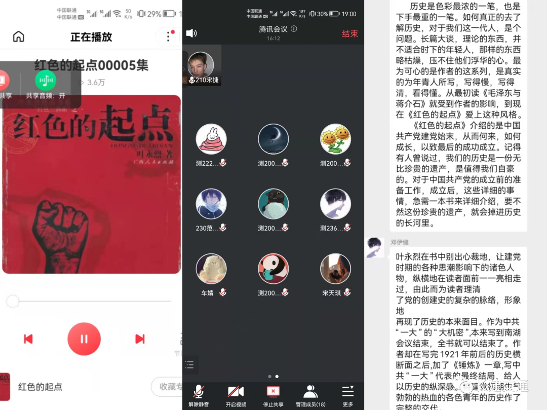 本次打卡书目为《红色的起点》,同学们以班级为单位,建立腾讯会议,每天播放半个小时并进行打卡,打卡结束后,在班级群内发表自己的感想。《红色的起点》深刻详细的描述了共产党建党之初的种种艰辛历程,从追寻中共“一大”详细地址的艰难,到马克思主义在我国兴起的前奏;从俄国共产主义在我国的酝酿,再到《新青年》共产阵营的初创;从少数我国共产主义早期探索者的响应,到大批马克思主义者聚首推行马克思主义;从中国共产党的艰辛成立,到成立后艰苦卓绝的奋斗革命史。