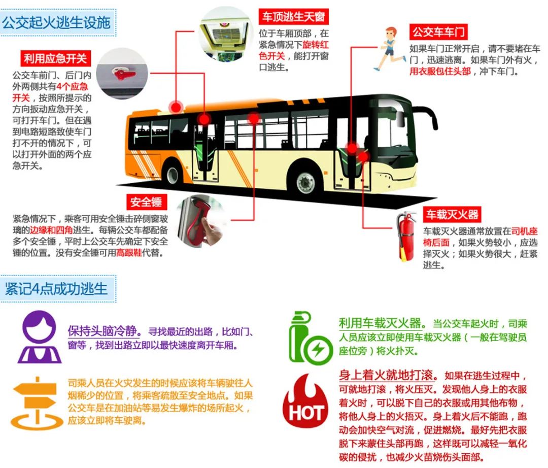 逃生首选通道是车门,车门能正常开启时,乘客就近从前后车门下车,先逃离乘客可协助司机,在门边疏导、保护。逃生时,让老人小孩先离开。车门附近有火时,用衣服包住头,冲出去。