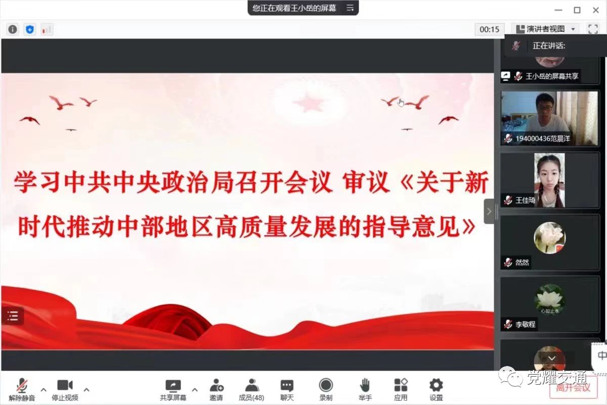 2022年6月8日中午11:30,公司开展学习中共中央政治局召开会议审议《关于新时代推动中部地区高质量发展的指导意见》内容的学习。本次学习由公司党总支副书记马琰主持,员工党员王小岳主讲,全体员工党员参加。由于疫情影响,本次会议线上进行。
