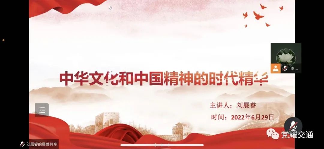 2022年6月29日中午,公司开展“中华文化和中国精神的时代精华”主题学习活动,本次学习由员工党员刘展睿主讲,团委书记杨婉及全体员工党员参加了此次活动。由于疫情原因,采用线上方式召开。