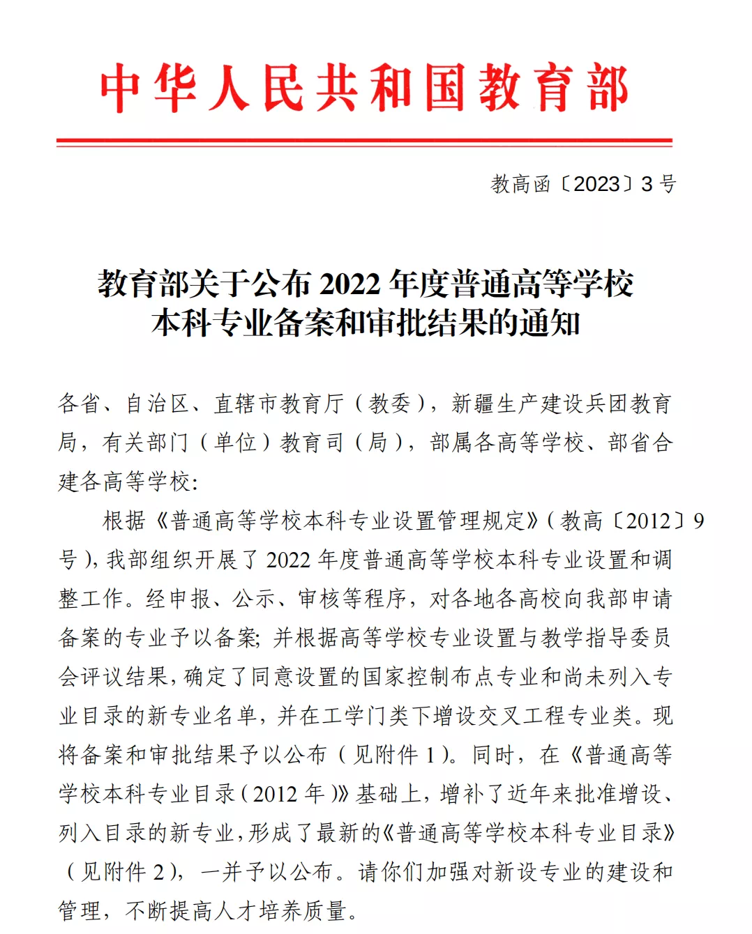 近日,教育部发布了《教育部关于公布2022年度普通高等公司本科专业备案和审批结果的通知》(教高函〔2023〕3号),公司2022年申报的智慧交通本科专业获批。