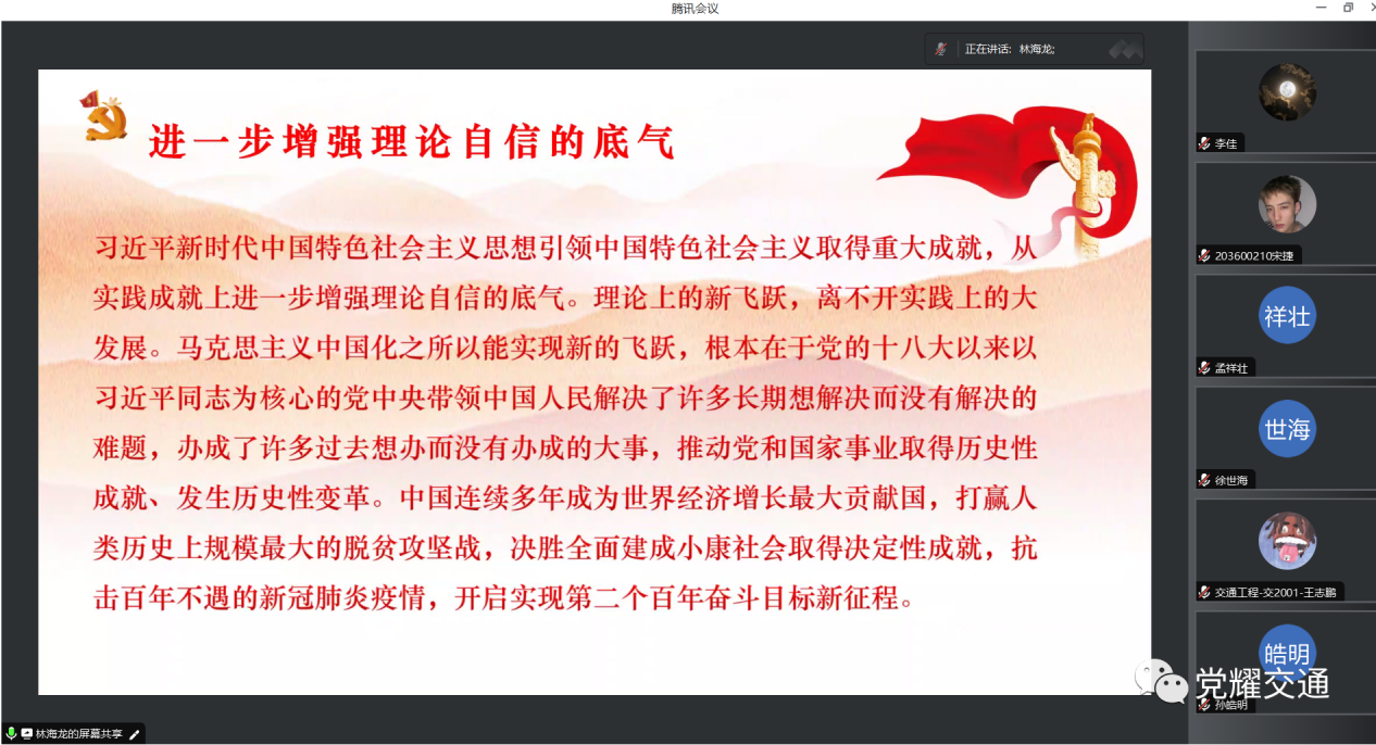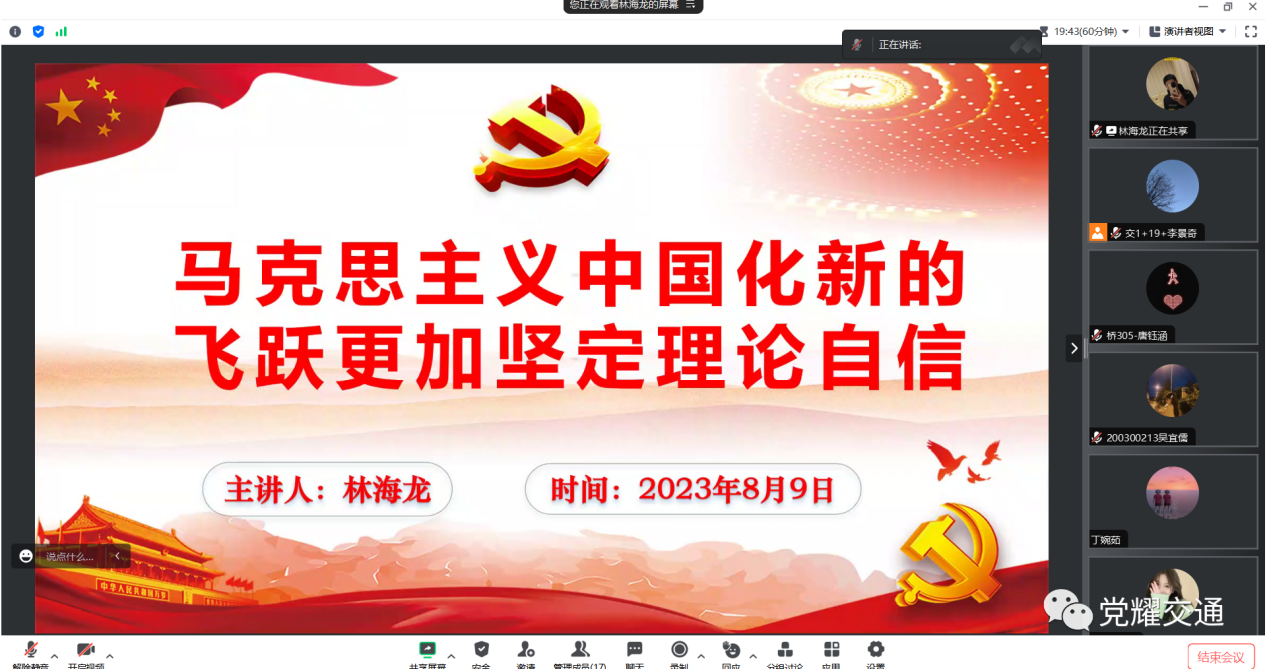2023年8月9日中午11:30,公司开展《马克思主义中国化新的飞跃更加坚定理论自信》内容学习,本次学习由员工党员林海龙主讲,公司党总支副书记马琰出席。暑假期间,本次会议线上进行。