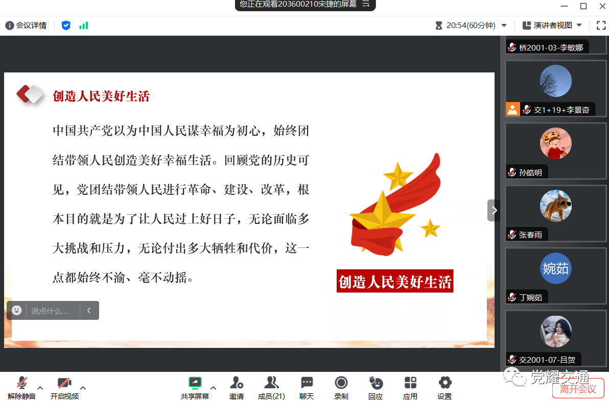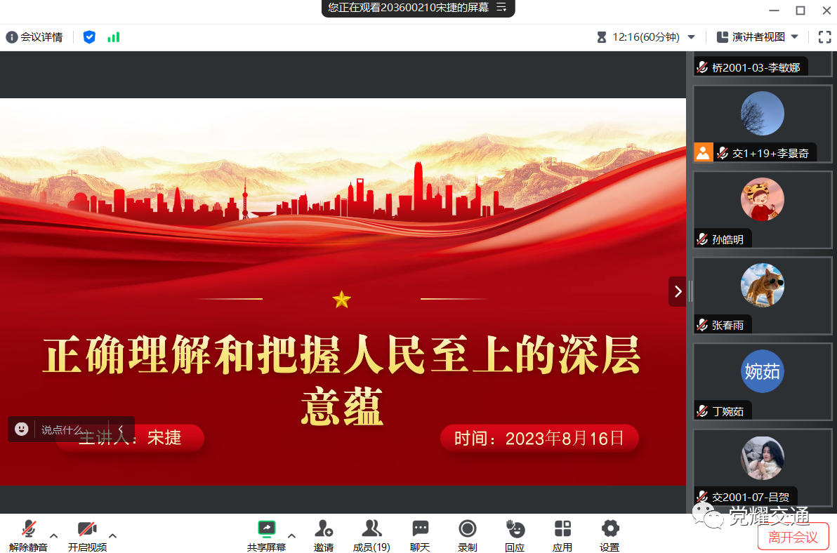 2023年8月16日中午11:30,公司开展《正确理解和把握人民至上的深层意蕴》内容学习,本次学习由员工党员宋捷主讲,公司党总支副书记马琰出席。暑假期间,本次会议线上进行。