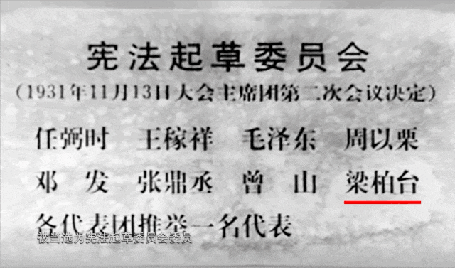 同年11月7日,中华苏维埃第一次全国代表大会在江西瑞金召开,梁柏台出席大会,当选大会主席团宪法起草委员会成员。大会通过了梁柏台参与起草的《中华苏维埃共和国宪法大纲》,成为中国共产党领导工农大众制定的第一部红色宪法。