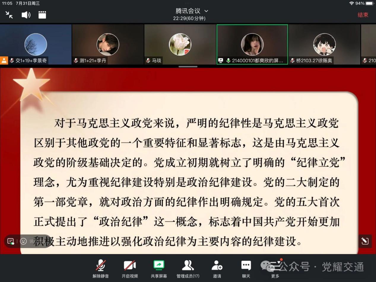 2024年7月31日中午11:00,公司开展《深刻领悟习近平总书记关于党的自我革命的重要思想》内容学习。本次学习由员工党员都奭欣主讲,公司党总支副书记马琰出席。暑假期间,本次会议线上进行。