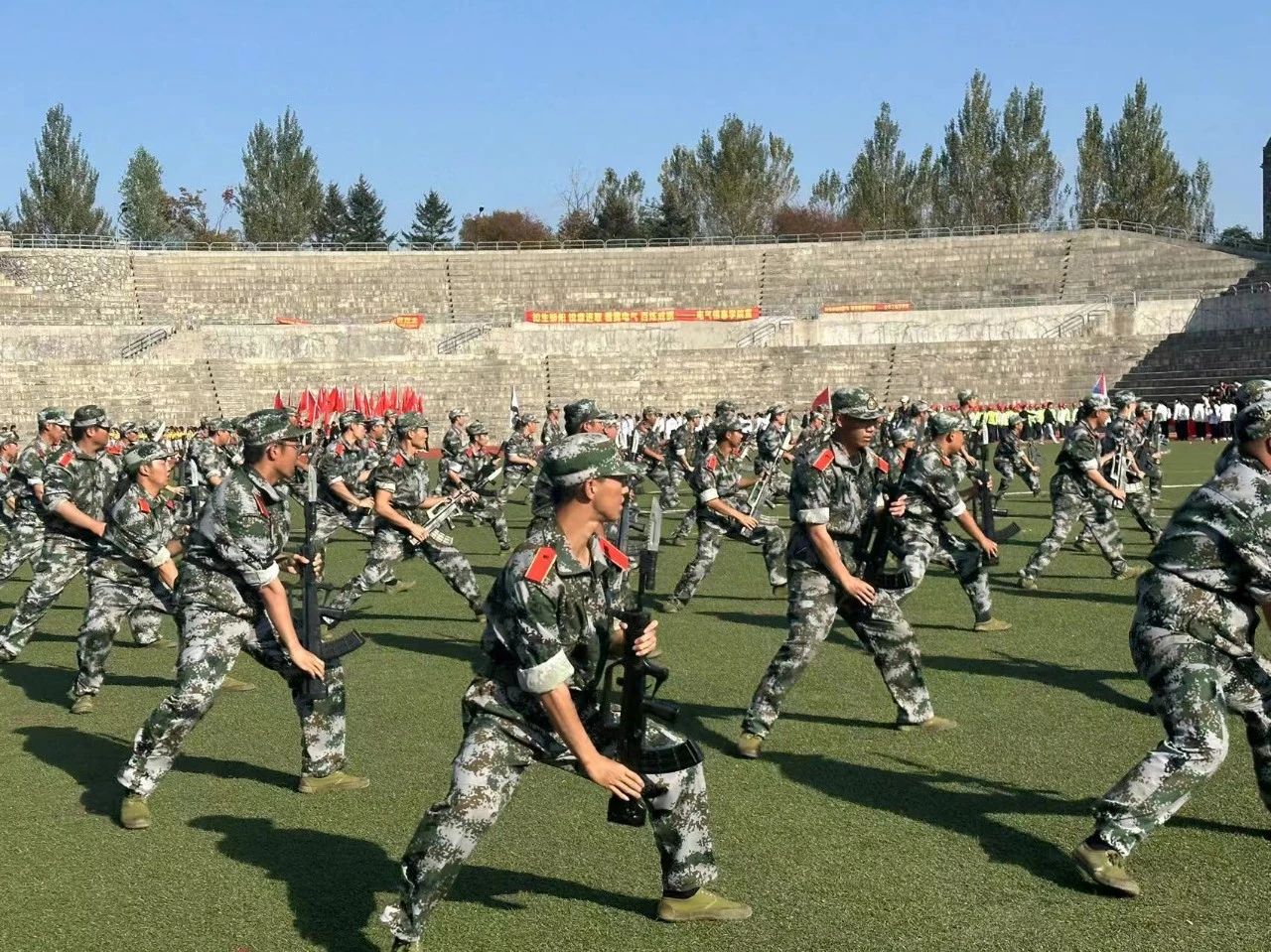 士气宏大的刺杀操表演给人一种耳目一新的感受,同学们用标准的动作汇报各自的军训成果。响亮的口号如春雷轰鸣,表达着同学们青春的无限活力与激情。一身靓丽的迷彩装,有如五线谱上跳动的旋律,演奏着属于当代老员工的精彩篇章。