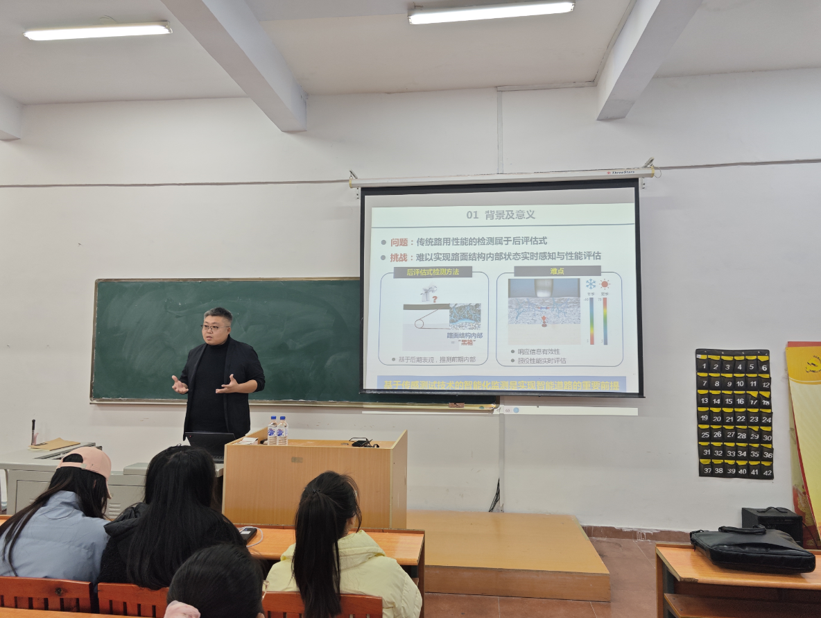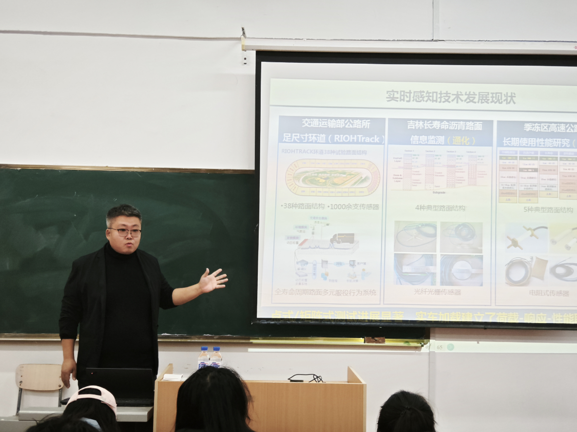 赵含工程师指出,在交通工程领域,季冻区的沥青路面面临着诸多挑战。由于季节交替带来的温度变化,路面容易出现裂缝、坑洼等病害,严重影响道路的使用寿命和行车安全。而分布式光纤监测技术作为一种先进的监测手段,能够实时、准确地获取路面的温度、应变等信息,为路面的维护和管理提供科学依据。赵含工程师凭借其丰富的专业知识和实践经验,深入浅出地为同学们讲解了分布式光纤监测技术的原理。该技术利用光纤作为传感器,通过测量光纤中光的传播特性变化来获取路面的物理参数。同时,赵含工程师还详细介绍了该技术在季冻区沥青路面服役性能监测中的应用,包括裂缝监测、温度监测、车辙监测等方面。在讲解过程中,赵含工程师结合实际案例,生动形象地展示了该技术在保障道路安全、提高路面使用寿命等方面的卓越表现。