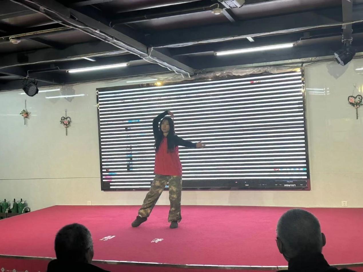 刚踏入养老院,志愿者们便立刻投入状态,精彩的节目表演随即拉开帷幕。虽无华丽舞台,但每一句歌声,都似山间清泉流淌,婉转悠扬,每一个动作也都饱含深情。活泼的旋律如灵动清泉,悄然流淌进老人心田,唤起他们的美好回忆。音舞公司的志愿者们也毫不逊色,她们的舞蹈轻盈似春日繁花,绚烂绽放,瞬间点亮了老人们的目光;激昂有力的红歌演唱,更是驱散了雨天的沉闷。老人们专注欣赏,脸上的笑容如春花般灿烂,岁月的皱纹似乎也被这欢乐抚平,眼神中满是对表演的喜爱陶醉。