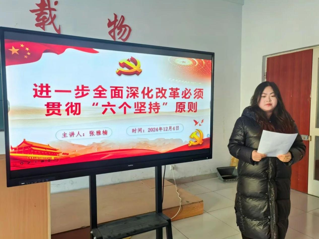 会议中,主讲人介绍:“党的二十届三中全会指出,总结和运用改革开放以来特别是新时代全面深化改革的宝贵经验,贯彻以下原则:坚持党的全面领导、坚持以人民为中心、坚持守正创新、坚持以制度建设为主线、坚持全面依法治国、坚持系统观念等原则。这“六个坚持”重大原则既是对改革开放以来特别是新时代全面深化改革宝贵经验的科学总结,也是我们党不断深化对改革的规律性认识的重大成果,对于增强进一步全面深化改革的科学性、预见性、主动性、创造性,推动改革行稳致远,具有重大指导意义。”六个坚持”重大原则是对改革开放以来特别是新时代全面深化改革宝贵经验的科学总结,充分体现了中国共产党人对马克思主义世界观和方法论的自觉运用和创新发展,深刻阐明了全面深化改革必须始终坚持的基本要点,实现了习近平总书记关于全面深化改革的重要论述的创新与发展。”