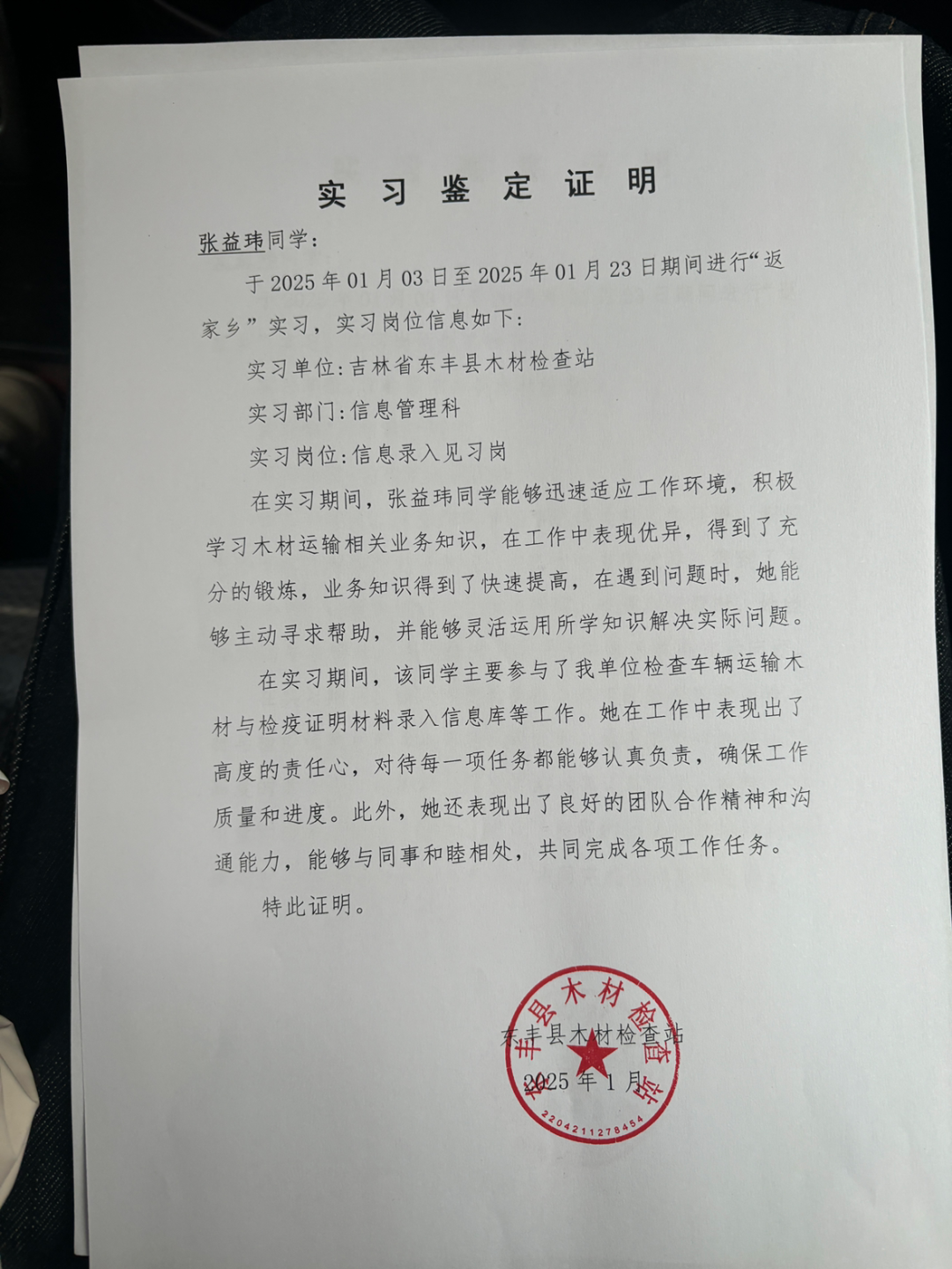 张益玮同学以志愿者身份加入东丰县木材检查站,担任检查信息管理员一职。在实习期间,他肩负起了运输车辆木材与检疫证明材料录入信息库等重要工作任务。初入岗位,他凭借自身优秀的适应能力迅速进入角色,充分发挥在公司锻炼出的语言表达能力,积极与同事沟通交流,快速了解工作流程与要点,确保信息录入工作的高效开展。
