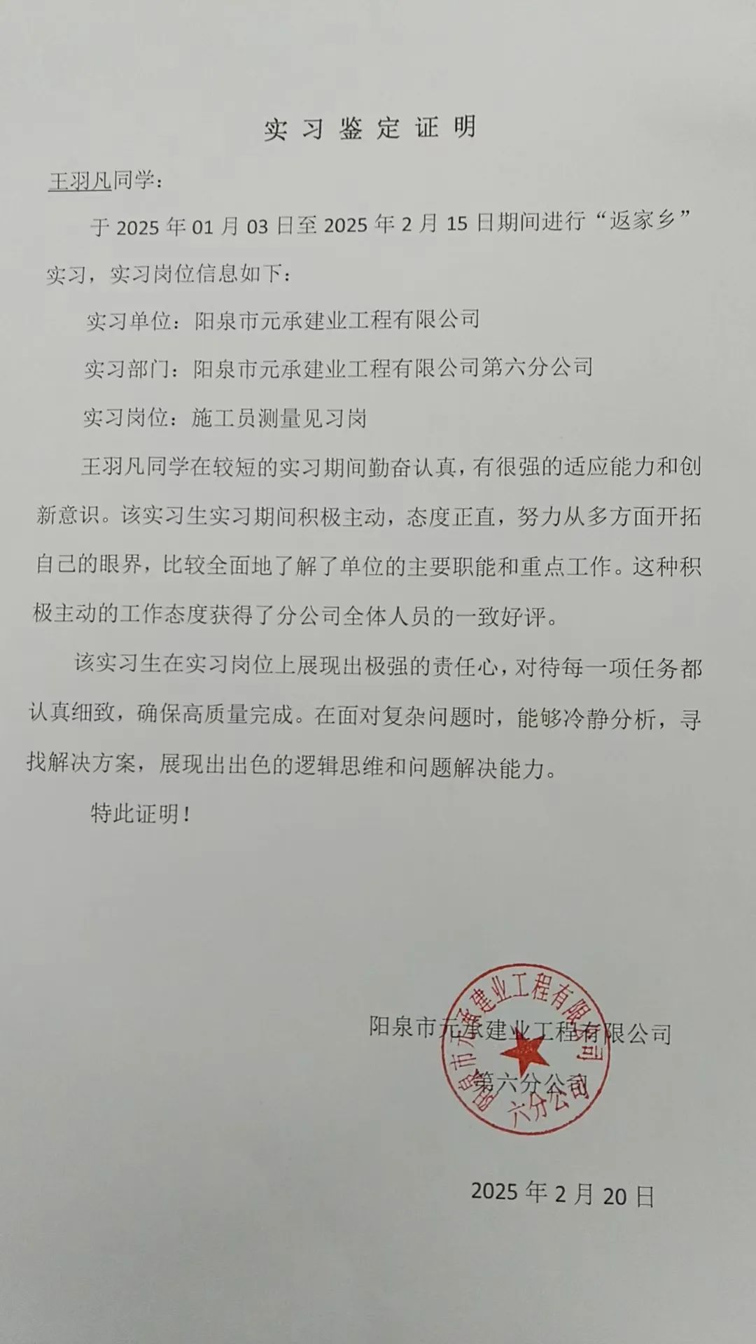 2025年1月3日,王羽凡同学怀揣着对工作的憧憬与期待,走进了山西省阳泉市元承建业工程有限公司第六分公司,开启了为期22天的“返家乡”实习生活。对于王羽凡同学而言,此次实习不仅是一次接触社会的历练,也不仅是充实自我的机会,更是为家乡发展贡献力量的宝贵契机。