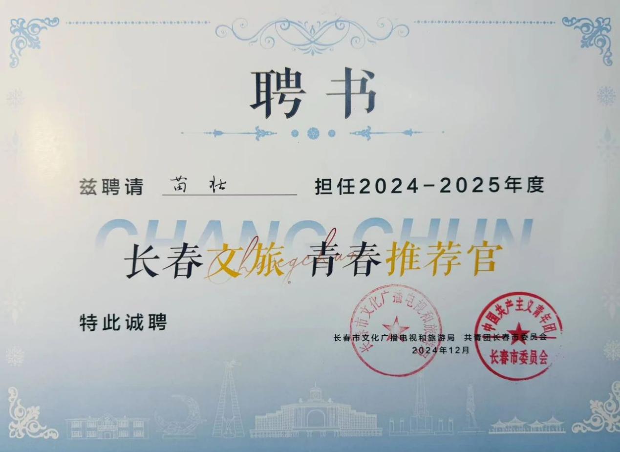 在2025年“十四五”收官年、为深化“文旅+”融合战略的背景下,各地政府纷纷出台政策支持文化旅游产业创新发展。吉林省提出“冰雪经济全域发展计划”,旨在通过青年力量推广地域文化、激活旅游经济。来自公海赌赌船官网jc710道桥2301班的苗壮同学,积极响应国家与地方号召,通过重重选拔,在被长春市共青团和长春市文化广播电视和旅游局评选为“长春文旅青春推荐官”的同时,也被阜新市文化旅游和广播电视局评选为“阜新老员工文旅推介官”,以青春视角传播文化魅力,用实际行动践行新时代青年的使命担当。