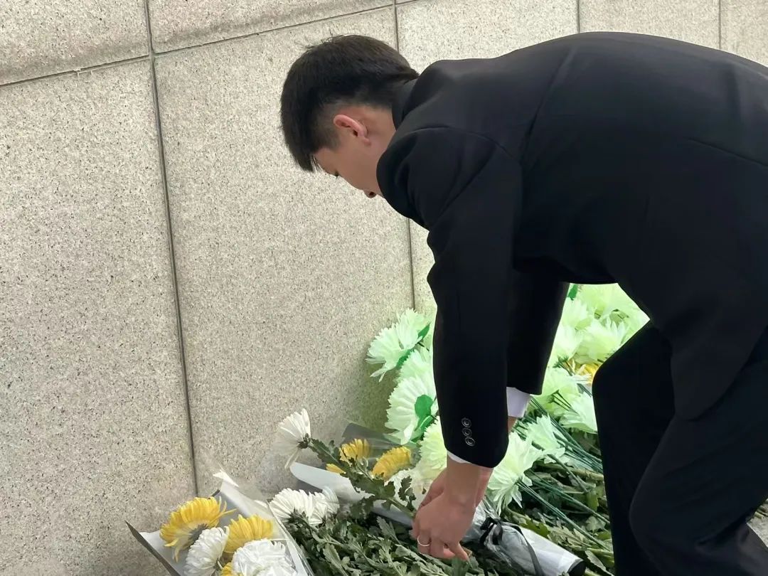 团委书记郭梓睿带领同学们缓步踏上青石台阶。当《献花曲》的旋律在松柏间回荡,轻轻将鲜花摆放在大理石基座上。他们列队默哀时,微风拂过墓碑,那一朵朵素白的菊花宛如振翅的白鸽,将无尽的哀思与敬仰载向碧空,在青松翠柏间定格成永恒的剪影。