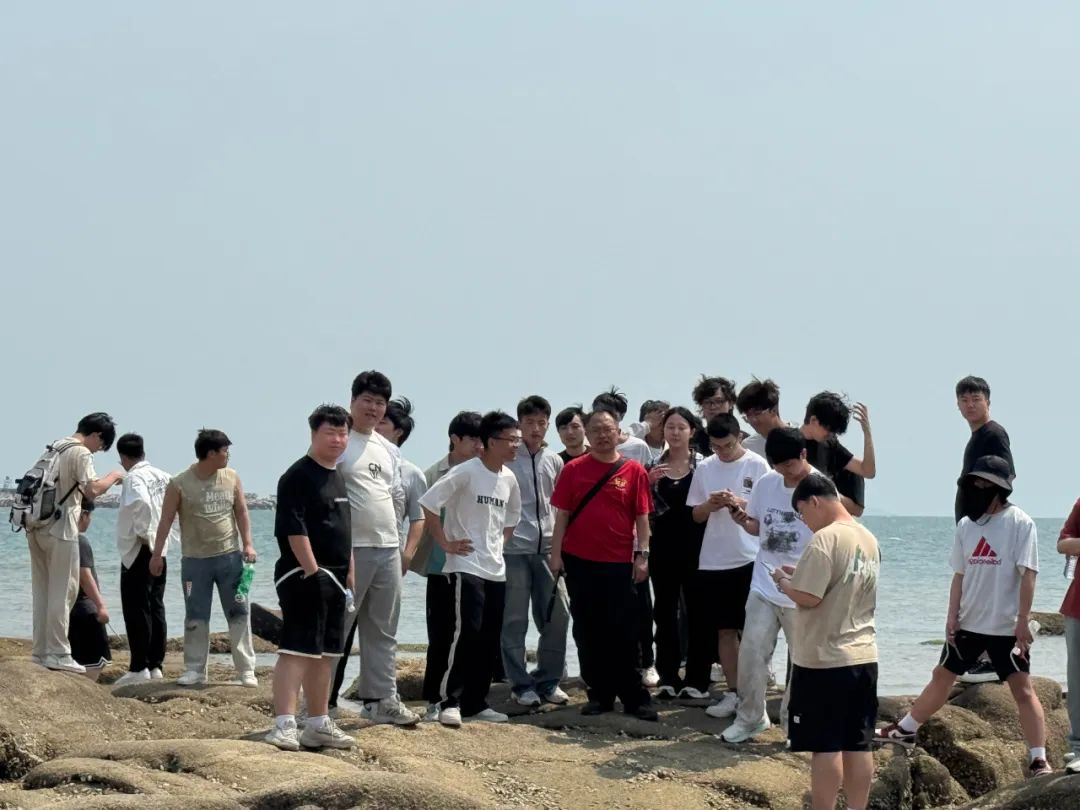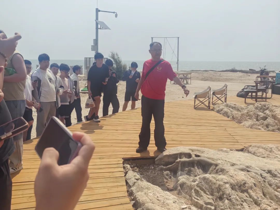 野外地质实习中,籍长志老师带领同学们沿海滨路线前行,同时提出关于海石崖和海石接地对路面的影响等问题,并针对现场海石侵蚀具体走向进行回答:“海石崖易受海风、海浪侵蚀,岩石风化剥落的碎屑可能堆积在临近路面,影响通行安全,且崖体若发生崩塌,巨大石块坠落会直接砸毁路面结构,造成严重损坏;海石接地处,海水长期浸泡、冲刷路基,会使土壤含水量增加,路基承载力下降,导致路面出现沉降、开裂等问题,同时海水中的盐分还会腐蚀路面材料,加速沥青老化、混凝土劣化,缩短路面使用寿命,涨潮时海水漫过路面还可能带来泥沙淤积,影响路面平整度与使用功能。”