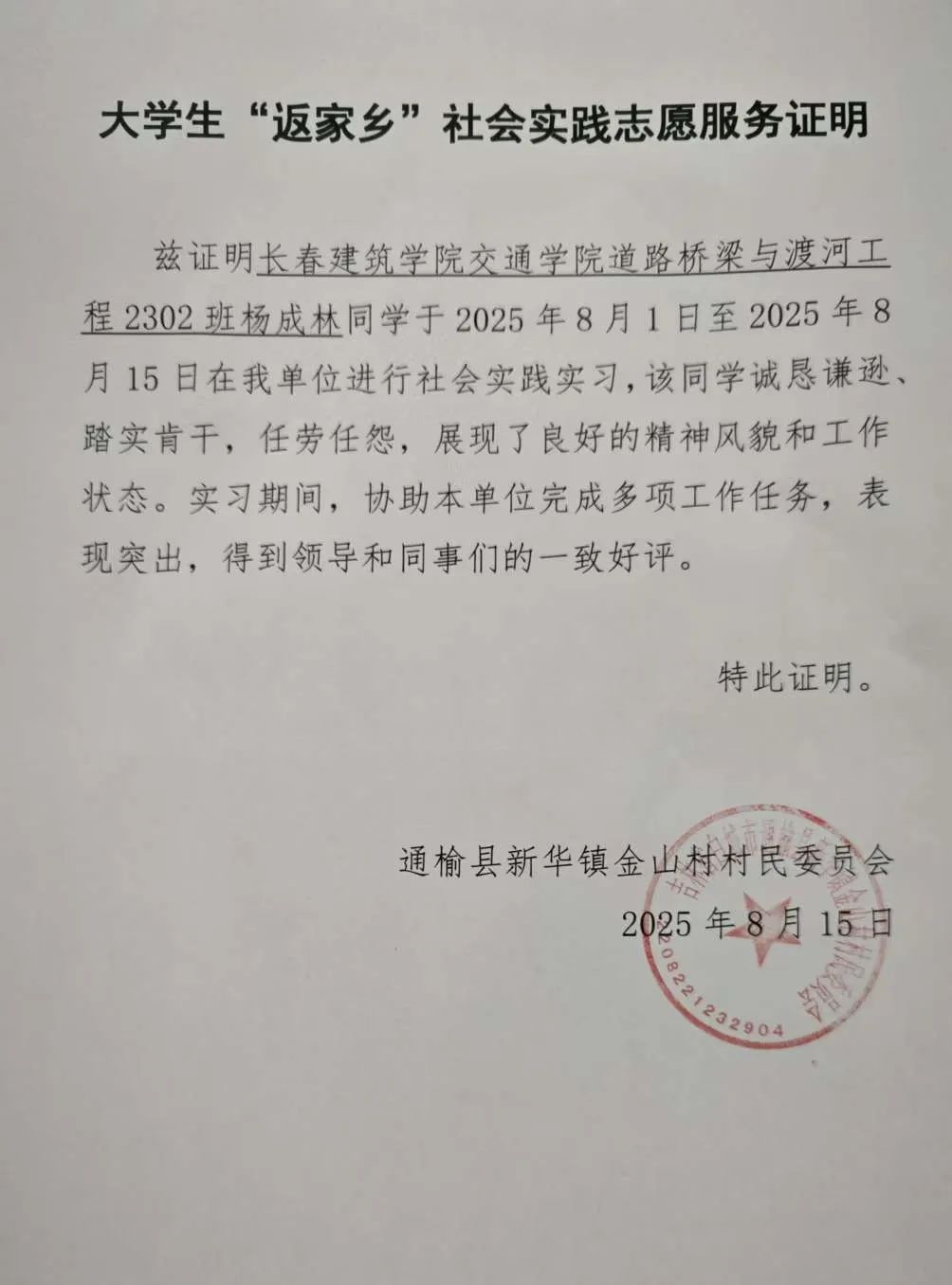 这次社会实践活动让杨成林同学深刻体会到了基层建设和服务家乡的重要意义。他表示,在今后的学习和生活中,会继续深入学习习近平总书记关于青年工作的重要思想,以实际行动践行五四青年节对全国广大青年的寄语精神,努力钻研道路桥梁与渡河工程专业知识,全面提高自身素质,为投身基层建设、服务家乡发展贡献自己更大的力量。